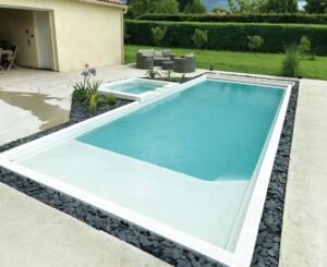 La piscine Malibu séduit par ses lignes épurées et sa profondeur idéale pour toute la famille. Elle existe en deux versions : classique et avec volet immergé automatique.